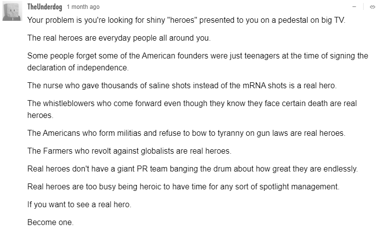 The ZeroHedge story linked above is illuminating, but the real insight is in the comments. For example, this one, in response to another woebegone poster who wrote, “Musk? Deep State? Trump? Deep State? Alex Jones? Deep State? So there are ‘zero heroes’? Such a bleak world. :/”