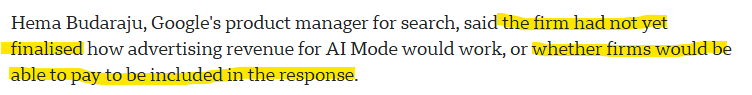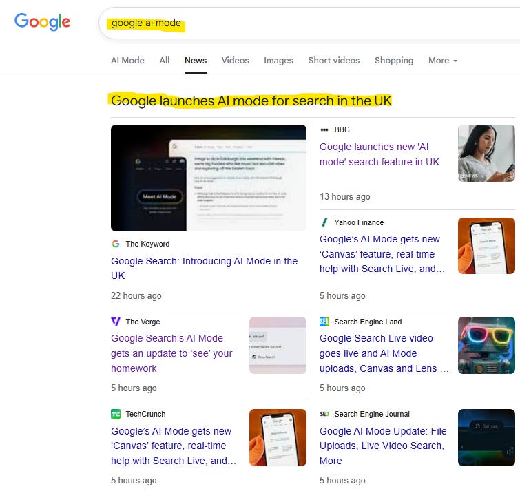 Here’s the most terrifying aspect: Google will even decide what it is you’re searching for for you (and then refuse to let you search anything else). Case in point: THIS SUBSTACK. I searched simply “google ai mode” to see what news stories it would produce; it automatically and persistently deferred to “Google launches AI mode for search in the UK” and would not cough up any results that weren’t specific to the UK.