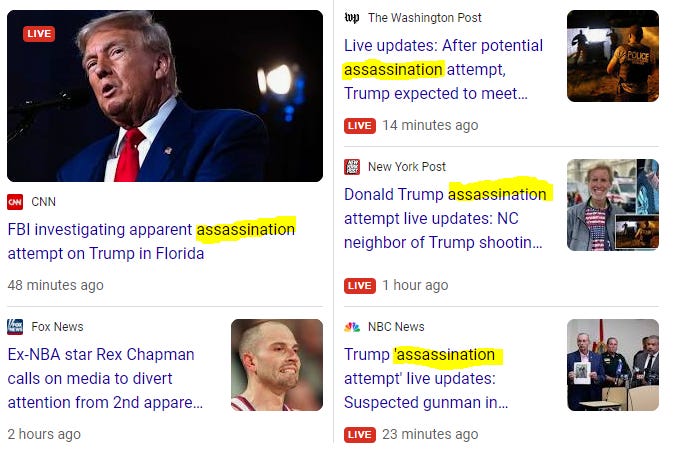 In other news, I didn’t have the energy to cover yesterday’s second assassination attempt on President Trump but as always, Jeff Childers was on it bright and early. All I can say is that at least this time, the media is actually calling it what it was and not “some popping noises” in the general vicinity. And for the love of all that is holy, could someone please get that man a bulletproof bubble? TIA.