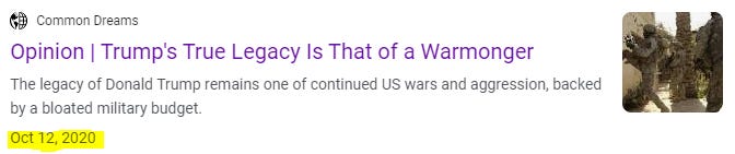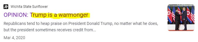 A warmonger (and sorry for always being so damned literal, but it’s my job), is a person, leader, or group that advocates for, promotes, or deliberately seeks war or conflict, often for political, economic, or ideological reasons. To hear the media tell it, Trump is the reincarnation of Genghis Khan and Alexander the Great rolled into one bellicose political baron. (Maybe journalists don’t actually know what the word warmongering means? Seems likely.)