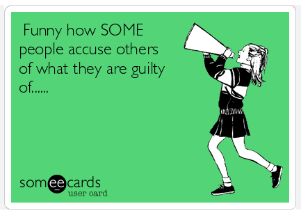 In psychological circles, the tactic is called projection, and it’s used to deflect suspicion, criticism, and accountability. A classic example is when a cheating spouse accuses their committed partner of being unfaithful. Most of us [who are not in fact getting some side action and hoping to continue to get away with it] wouldn’t respond to such an allegation with, “I’m certainly not cheating, but I bet you are!” No, our instinct would be to try to defend ourselves. We’d ask out partner why on earth they would think such a thing and wonder what we’d done to sow a seed of doubt. We’d concentrate on being doting and loving and affectionate and steadfast. If we *did* have some quiet concerns about our partner’s fidelity, we’d promptly sweep them right under the rug. To do anything else would be the picture of paranoia. I mean, what sort of psychopath accuses an innocent someone else of doing precisely what they are doing?