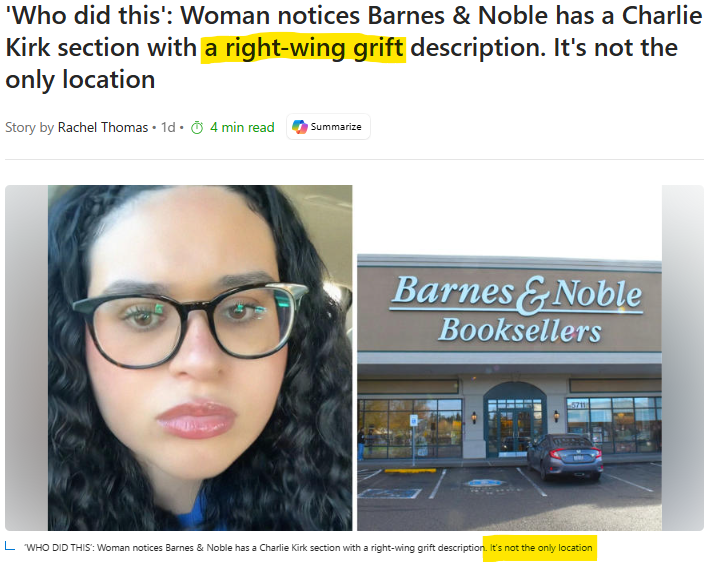 And the cherry on top? The piece proclaimed the Kirk display “right-wing grift,” all but implying that Charlie himself is running a MAGA con game out of the bookstore from the afterlife. But the word grift—or anything else even remotely swindle-adjacent—appears nowhere in the article itself. In fact, the writer goes on to explain that Barnes & Noble has always carried books across the political spectrum, corporate still controls inventory, and local managers decide what to highlight. So essentially, nothing unusual happened at all. The only “grift” here is the headline rage-baiting readers into a non-story.