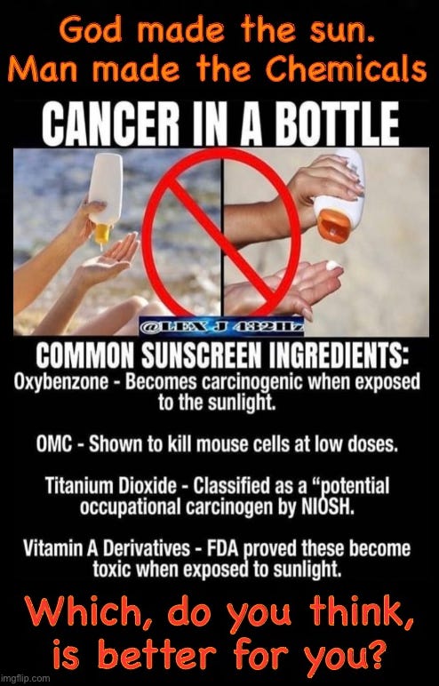The narrative: Sun exposure won’t just turn you into a shriveled human prune; it’ll give you deadly melanoma. Avoid it at all costs! Stay inside on sunny days! And if you can’t, for the love of luminosity, spray yourselves—don’t forget your kids!—with this toxic chemical cocktail from head to toe. Repeat hourly.