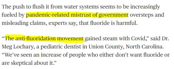 The narrative: Prevent decay and strengthen tooth enamel with fluoride! Too lazy to come into the dentist for semi-annual professional treatments? Fine, we’ll put it in your toothpaste, your mouthwash, your water. You don’t even have to think about it won’t be able to avoid it if you try. You’re welcome.