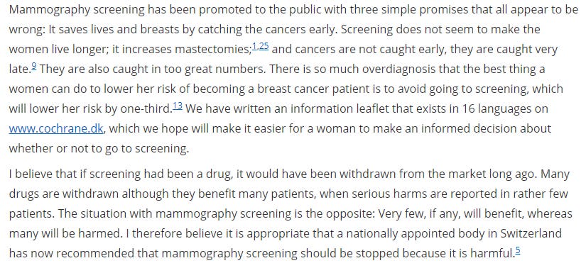 The narrative: Early detection is critical. Annual screening is the answer. Never mind that decades of screening have not reduced associated mortality one iota, or that mammography frequently finds tumors that would never have led to clinical symptoms at all, or that a recent review found “mammography is harmful and should be abandoned.” You can trust us, really.