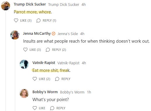 I went to Offit’s Substack with a mostly open mind, curious to see whether there were other dissenters (very few) or substantive rebuttals (even fewer). When I respectfully disagreed with some of his points, the response was jarring. There were no counterarguments or data—just a torrent of abuse. Sexual slurs. Name-calling. Middle-school filth.