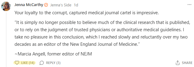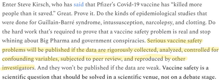 Kirsch’s claim—that COVID vaccines may have caused more harm than acknowledged—might be wrong. (I mean, we know it’s not; that’s me being journalistically generous.) But refusing to debate it doesn’t refute it. It just ensures the question never leaves the lab, the journal paywall, or the polite echo chamber where everyone already agrees.