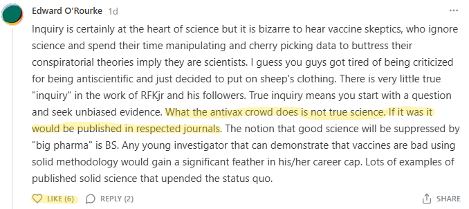 There were fewer than fifty comments when I initially weighed in on Offit’s post (as of this writing, there are 452). This one was near the tippy-top—in response to my point that “real science doesn’t fear questions”:
