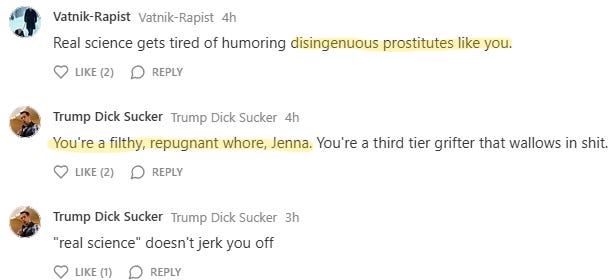 (It’s worth noting that these folks are almost certainly posting from a bot farm in Bangladesh. But still—this stuff doesn’t write itself. Someone woke up, logged in, and decided this was a meaningful way to make a buck today. And Offit hasn’t deleted their slurs or blocked them from continuing to comment.)