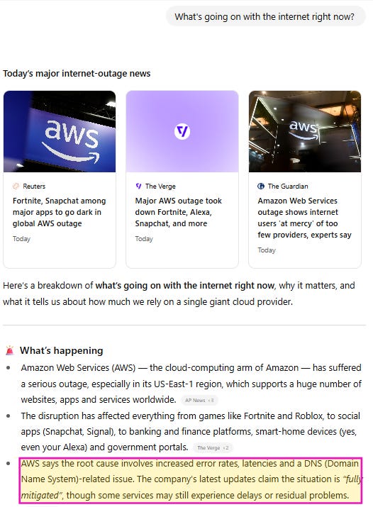 Was it happening? Was this Zee Frightening Scenario of a Comprehensive Cyber Attack we’d been promised? And if so, why were X and Downdetector still working? I checked my own website, my husband’s site, AP News. All cruising. ChatGPT—likewise operational—confirmed the widespread outage, although it offered little in the way of an explanation. (“Increased error rates and latencies” sounds more like a symptom than a cause to me.)