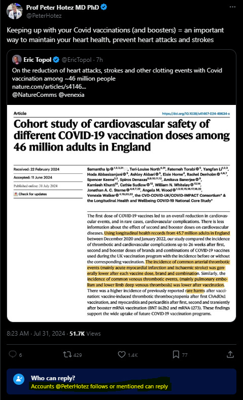 Inexplicably, Hotez has nearly a half million followers on X, a site he seems to visit daily to trot out the latest scarient and blow his public health horn. For some *cough* weird reason, the prolific professor only allows folks he follows to comment on his jab-happy posts…