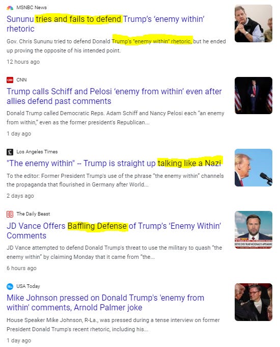 “Donald Trump is suggesting that his fellow Americans are worse ‘enemies’ than foreign adversaries,” a Harris campaign spokesperson sniveled in a statement. “Until recently, this kind of language was not a normal part of American presidential politics,” The Atlantic sulked in a piece comparing Trump to Hitler, Stalin, Mussolini, Mao Zedong, and Pol Pot. “CNN Anchor Left Lost for Words By Trump’s Chilling Enemy Within Comments,” a Daily Beast headline roared before popping a Xanax and wrapping itself in a weighted blanket.