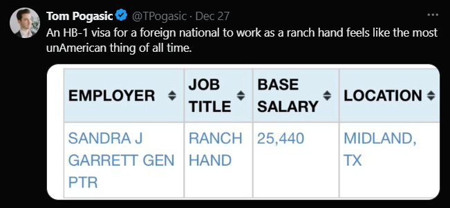 At the end of the day, the issue here isn't that we're being overrun by these foreign visa holders, and also, *when* they truly aren't taking away any of our domestic jobs, these foreigners are a net positive to our economy because they're highly paid (on average) which means they contribute lots of taxes, and at the same time don't receive any benefits. So compared to our illegal immigration problems this is night and day and we've got a million other bigger problems as a country.