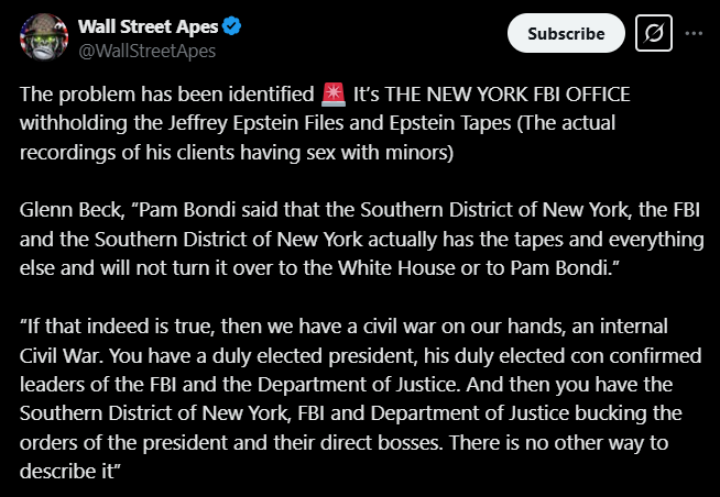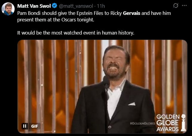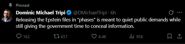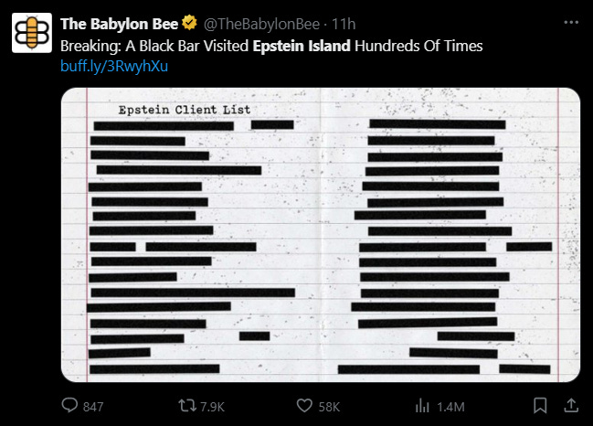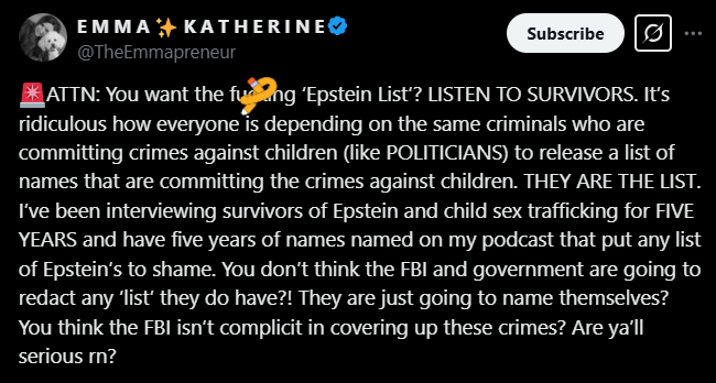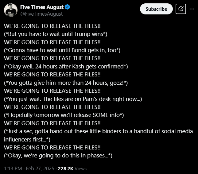 As you would imagine, #Epstein was trending on X all day, with lots of armchair reporters speculating about every aspect of the release and pointing figures at anyone with a binder pulse and calling the info recipients “paid propagandists” and claiming—accurately as far as I can see—that Dump #1 contains absolutely nothing that hasn’t already been released.