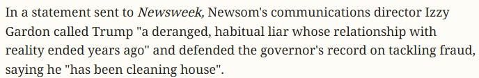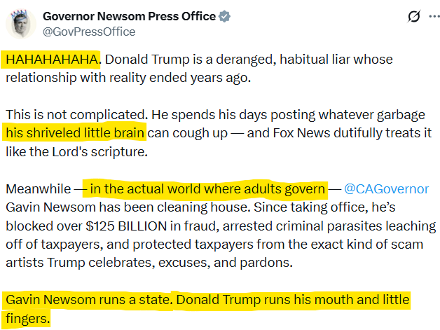 Instead of the usual “we take these allegations seriously” boilerplate, Newsom’s office went full Rottweiler mode, describing Trump as a “deranged, habitual liar” with a “shriveled little brain,” dismissing corruption claims as fairy tales involving unicorns and leprechauns and (I am not making this up) erectile dysfunction cures, and reminding everyone—loudly—that California has allegedly blocked over $125 billion in fraud (a claim that pairs poorly with a government-issued “HIGH-RISK” stamp, but okay). And because politics and the third grade playground are now indistinguishable, naturally he trotted out the tired “tiny hands” trope.