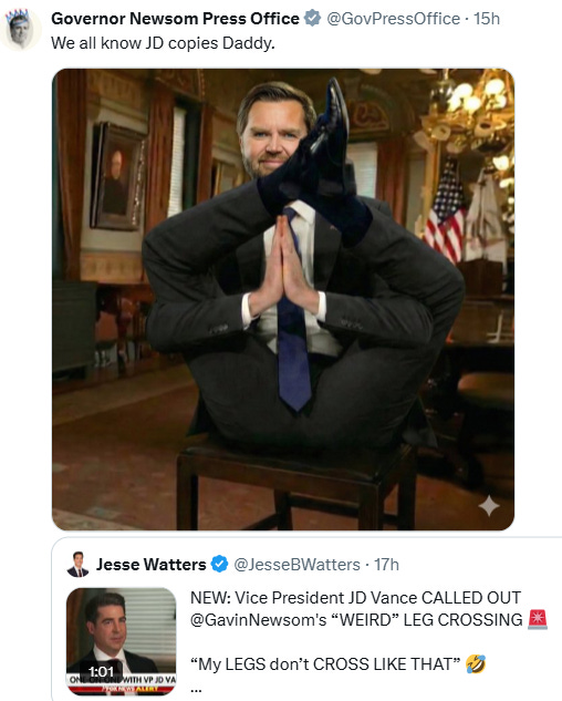 The left couldn’t compete. Kamala cackled. Biden pounded the podium and squinted. Hillary, to her credit, could at least land a zinger before retreating back to policy white papers and moral lectures. But Newsom isn’t pretending to be above the fray. He’s jumping into it with sleeves rolled up and a social media team that clearly hasn’t slept since June.