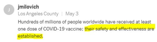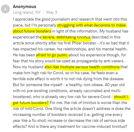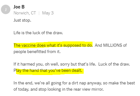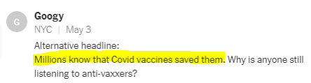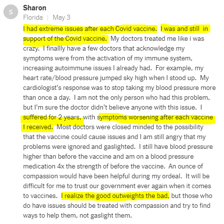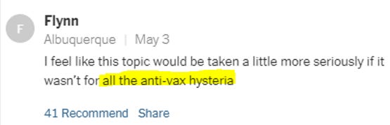 Interestingly, the article was not behind the typical NYT paywall, and comments—for a while—were allowed. They’ve since been turned off, but naturally I perused a decent chunk of the 1.9K they let stand. Many, as anticipated in the very article, were angry at the Times for adding fuel to the “crackpot” anti-vax fire.