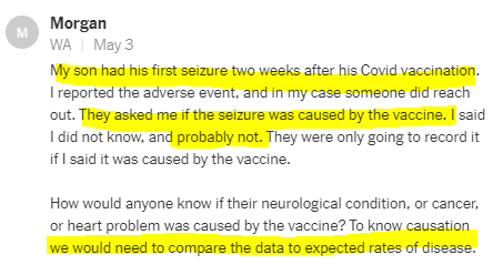 By now you’ve probably read the article. If you haven’t, allow me to summarize it for you: Some people are claiming terrible, horrible, no good, very bad things happened after getting a Covid vaccine, which is “a triumph of science and public health estimated to have prevented millions of hospitalizations and deaths” [not counting the millions they caused] and which was administered to “hundreds of millions of people [countless of whom are now irreparably injured or dead] under the most intense safety monitoring in US history.” [Literally, none.] Unfortunately, there’s just no real way to identify potential vaccine side effects, you see, on account of “the nation’s fragmented health care system” and its “understaffed compensation fund.”