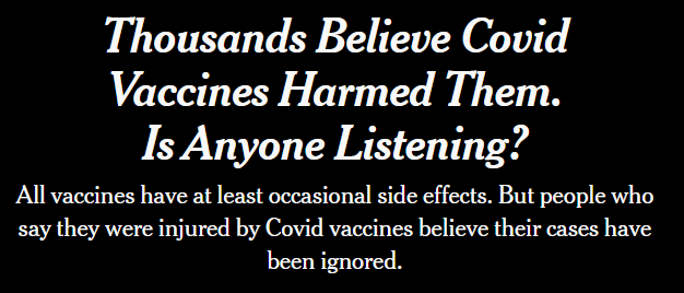 ICYMI, either the dam actually is breaking as Jeff Childers suggests (I’m not quite as hopeful as Jeff, TBH), or the New York Times is somewhere around Step 7 or 8 in Fauntleroy’s Limited Hangout Limbo. In a post that allegedly broke the internet for at least a few minutes, the left leaning lying old Gray Lady actually admitted that thousands of people have been harmed by Covid vaccines.
