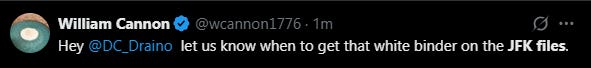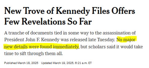 For now, I mostly have questions. First, and rhetorically, is this whole circus nothing but an attempt to distract us from the Epstein files they promised us and then furiously backpedaled on? Considering that the bad guys in the Epstein case are likely still alive whereas the ones who conspired to kill Kennedy are almost definitely dead… where’s the ire about that? Or at least, an official White House update? Why did Trump ultimately decide to release information that he previously described as “far too incriminating to ever share with the American people” during his first term? When did it become the public’s job to comb through historic records to solve the biggest whodunnit in history? They’ve had this info since before I was born. Would it have been so incredibly tedious to publish a one-page executive summary—or even a one sentence one!—with links to the backup?