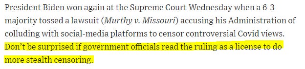 Late last month, two states (Missouri and Louisiana) and a group of individuals sued executive branch officials and agencies, alleging they had violated the First Amendment by encouraging and/or coercing social media platforms to censor anti-vaccine content. Despite federal judge Terry A. Doughty dubbing the Biden Administration’s actions “the most massive attack against free speech in United States’ history,” the SCOTUS shot that duck dead in the water, essentially declaring that the plaintiffs had not suffered any injury [!!!!!] and that the lawsuit had no legal standing. Louisiana Attorney General Liz Murrill blasted the decision, calling it akin to greenlighting “the worst government coercion scheme in history.”