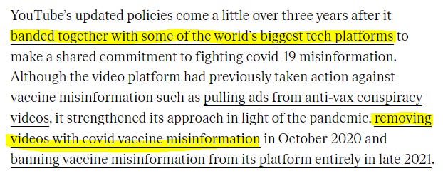 “Content that poses a serious risk of egregious harm by spreading medical misinformation about currently administered vaccines that are APPROVED AND CONFIRMED TO BE SAFE AND EFFECTIVE by local health authorities and the World Health Organization isn’t allowed on YouTube.”