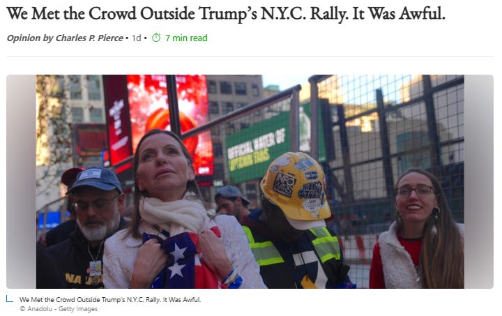 Case in point: Once considered sophisticated and culturally relevant, Esquire published a sniveling bit of drivel this week lamenting the “Nazi rally” that was Trump’s Madison Square Garden meet-up. (You know, the one that was populated with people from all faiths and all walks of life, where they sang “Hallelujah” on stage while Megan Thee Stallion was twerking for free concert junkies Harris supporters?) The Esquire piece is so poorly written, so utterly nonsensical, so fraught with irony (“they are burlesque authoritarians”) and mixed metaphors (“the opening round in a Republican attempt to ratf*ck the certification process”) and hyperbole (“You could feel the world turning toward darkness”) that I struggled to come up with an apt analogy. (I think I finally nailed it though: If this article were a lasagna, it would have been baked by a toddler using pool noodles, expired ketchup, grated cat litter, and a bunch of plastic vegetables from his play kitchen. To borrow from the author itself, it was awful.)