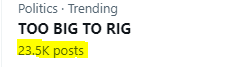 Rigging may be de rigueur for dems anymore, but this time around at least, the “silent majority” know what we’re up against. #TooBigToRig isn’t just a rallying cry or a catchy slogan; it’s a reminder that as good as things may look—and I’ll tiptoe out on a limb here and say they do look good at the moment—it ain’t over until the official @POTUS account gets transferred back to the mean tweeter.