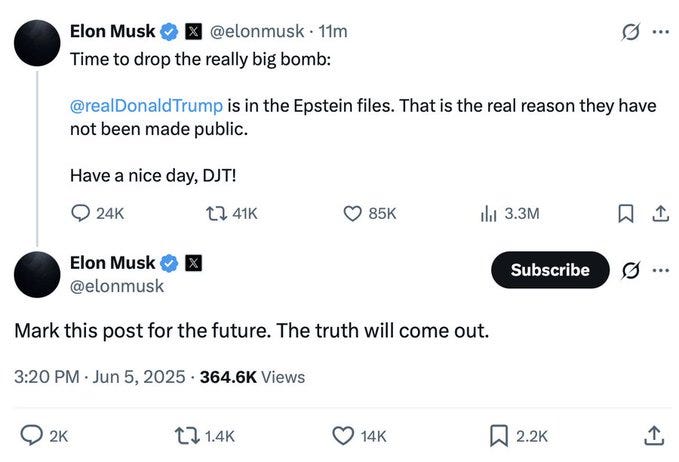 One theory posits that the spat was part of Musk’s bigger plan to oust Trump and replace him with “Technocrat wonder boy, JD Vance.” At the far end of the sea-saw, Journalist Liz Crokin is calling the whole thing a “fake feud” and insists that the hugely public drama is Deep State Bait; that the whole feud is a set-up to bring the Epstein scandal back into the spotlight—so that democrats will start demanding the release of the files.