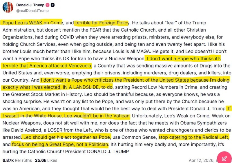 “Leo should be thankful because, as everyone knows, he was a shocking surprise,” Trump wrote, in case you missed that part. “He wasn’t on any list to be Pope, and was only put there by the Church because he was an American, and they thought that would be the best way to deal with President Donald J. Trump. If I wasn’t in the White House, Leo wouldn’t be in the Vatican.”