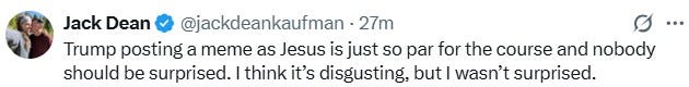 And just in case the “weak on crime” critique didn’t fully land, Trump followed it up by posting an AI-generated image of himself cosplaying, well, the Son of God. The digital artwork showed Trump performing what appeared to be a hands-on healing, surrounded by adoring followers, the American flag, a bald eagle, the U.S. Capitol, some soldiers, a Top Gun-style fighter jet flyover, the Lincoln Memorial (or possibly the Pantheon), the Statue of Liberty, and—of course—fireworks.