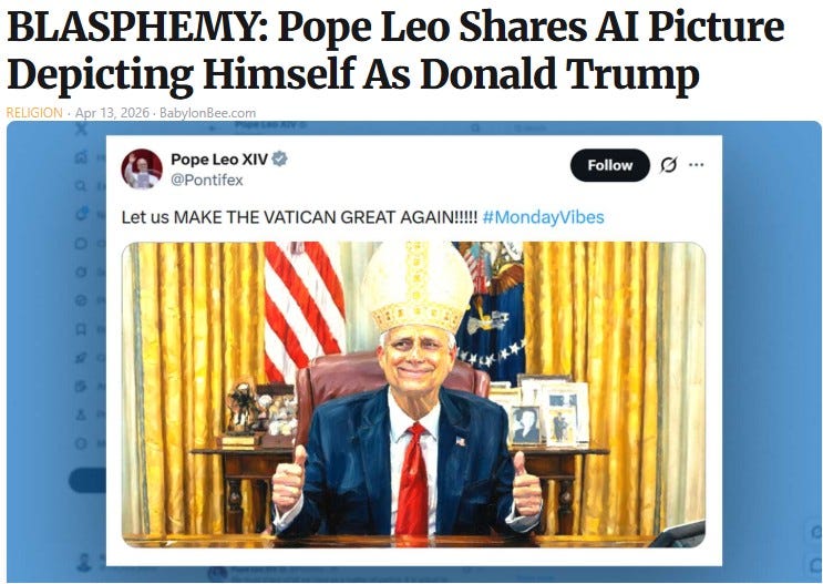 Yes, Trump openly suggested that the Primate of Italy—a man whose entire job description is “encourage folks to be more like Jesus”—needs to up his perp-wrangling game. And “I don’t want a Pope who thinks it’s terrible that America attacked Venezuela”? Really? We are not living in medieval times. These are not the Crusades. The Pope, by the very nature of his position, is sort of obligated to condemn anyone attacking anyone else. That’s not Advanced Theoretical Theology; it’s more like Gospel 101.