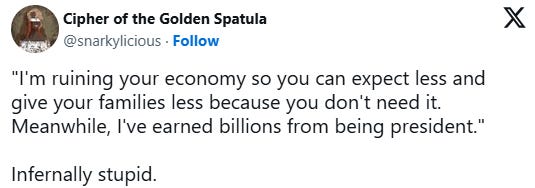 Then he briefly pivoted like a cat who just heard a can opener in the next room. In the same breath that he claimed to be stabilizing the economy, POTUS warned Americans they might, at some distant point, want to think about maybe learning to curb their gluttonous cravings for petty little luxuries.
