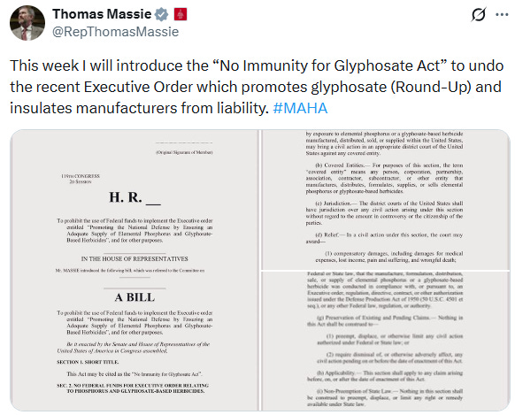 In response to Trump’s announcement, Representative Thomas Massie introduced the No Immunity for Glyphosate Act with bipartisan support. The bill seeks to undo parts of the recent executive order by preventing glyphosate manufacturers from claiming legal immunity under the Defense Production Act—basically preserving the right of individuals to sue companies for harms linked to the weedkiller. And when companies know they can be sued, they tend to behave slightly better than frat boys at an open bar. (Petitions supporting Massie’s act are cropping up like, well, weeds.)