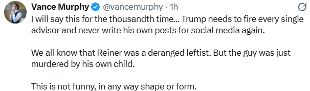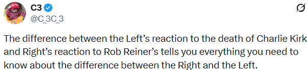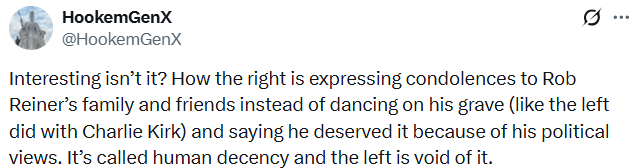 On Substack, writer Sasha Stone (who often characterizes herself as a former member of the “Democratic doomsday cult”) pointed out a sentiment echoed frequently on X: This is not a Charlie Kirk situation. Despite Reiner’s vocal disdain for all things MAGA, the vast majority of the right isn’t openly reveling in the loss of a human life.