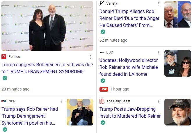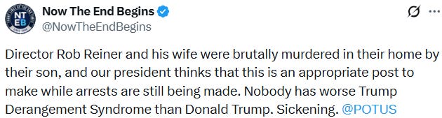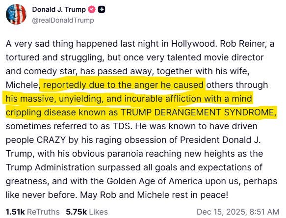 Within hours of the horrific news hitting the media fan, Trump took to Truth Social. And because he’s not, say, Nelson Mandela or Atticus Finch, he unleashed a rambling, comma-soaked monologue that did what Trump comms reliably do: it detonated on contact. Rather than offering conventional condolences or a professional tribute, he framed Reiner’s death through the lens of political obsession, invoking “Trump Derangement Syndrome” and suggesting that Reiner’s lifelong fixation on him had somehow consumed him. It was inappropriate, gratuitous, and—if I’m being honest—completely on brand.