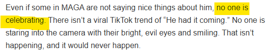 I actually did see a small handful of ugly—if not quite celebratory—posts online, but to the above point, nothing like the perverse glee we saw after Kirk’s assassination.