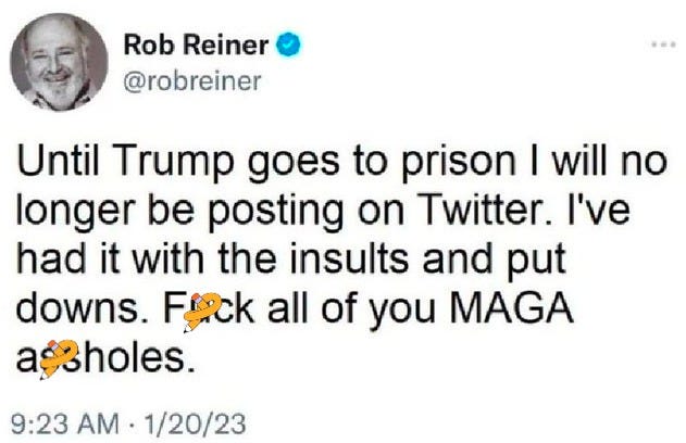 Trump supporters spent much of the day digging up every hateful thing Reiner ever said about POTUS, which could fill a small library and includes such gems as “malignantly narcissistic,” “moronic,” “mentally unstable,” and “the single most unqualified human being to ever assume the presidency of the United States.” “Imagine what Rob Reiner would have posted if Trump had died,” one X user wrote. “It would not have been half as nice as this post.” She’s not wrong.