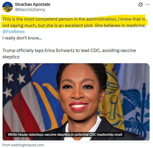 The optics are flawless: Schwartz is a (biological!) woman. She’s Black. She’s a veteran. A physician. A public health lifer with a string of impressive-sounding letters after her name. Naturally, we’re being treated to the very serious argument that this is proof DEI doesn’t exist—because sometimes the most qualified candidate is a Black woman. Get over yourselves. Meanwhile, the other side is weaponizing the exact same set of facts: See? Trump isn’t a racist or a misogynist—look who he just appointed!