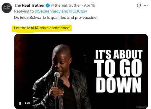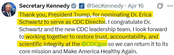 If RFK Jr. has been sidelined completely—as many now openly suspect—then so be it. What can we do? That’s the story. But if he hasn’t? If the structure is still in place, if the decision-making still flows the same way, if this is basically about putting a body in the chair—maybe just long enough to get through the midterms—then what, exactly, is Erica Schwartz walking into? A title? An office? An official-looking seat at a table where the menu’s already been decided?