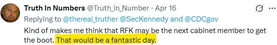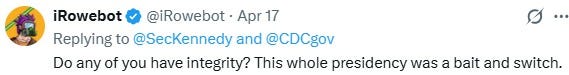 If you had asked MAHA supporters to sketch out their nightmare hire, you’d get Schwartz—or someone exactly like her. And rather than expressing disappointment with the decision, or saying nothing at all which would have at least hinted at disapproval, an increasingly neutered Kennedy applauded it. I mean, it wasn’t gushing or anything, but it was still more endorsement than regret or even resignation.