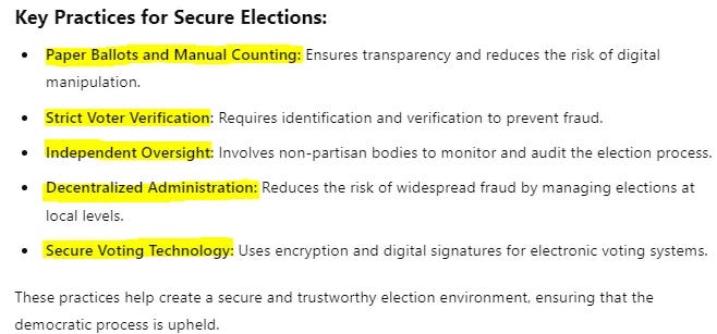In a previous post on the subject, I asked ChatGPT how to ensure a secure election. It was a straightforward prompt that produced a simple five-point plan. Seems pretty hard to argue with: