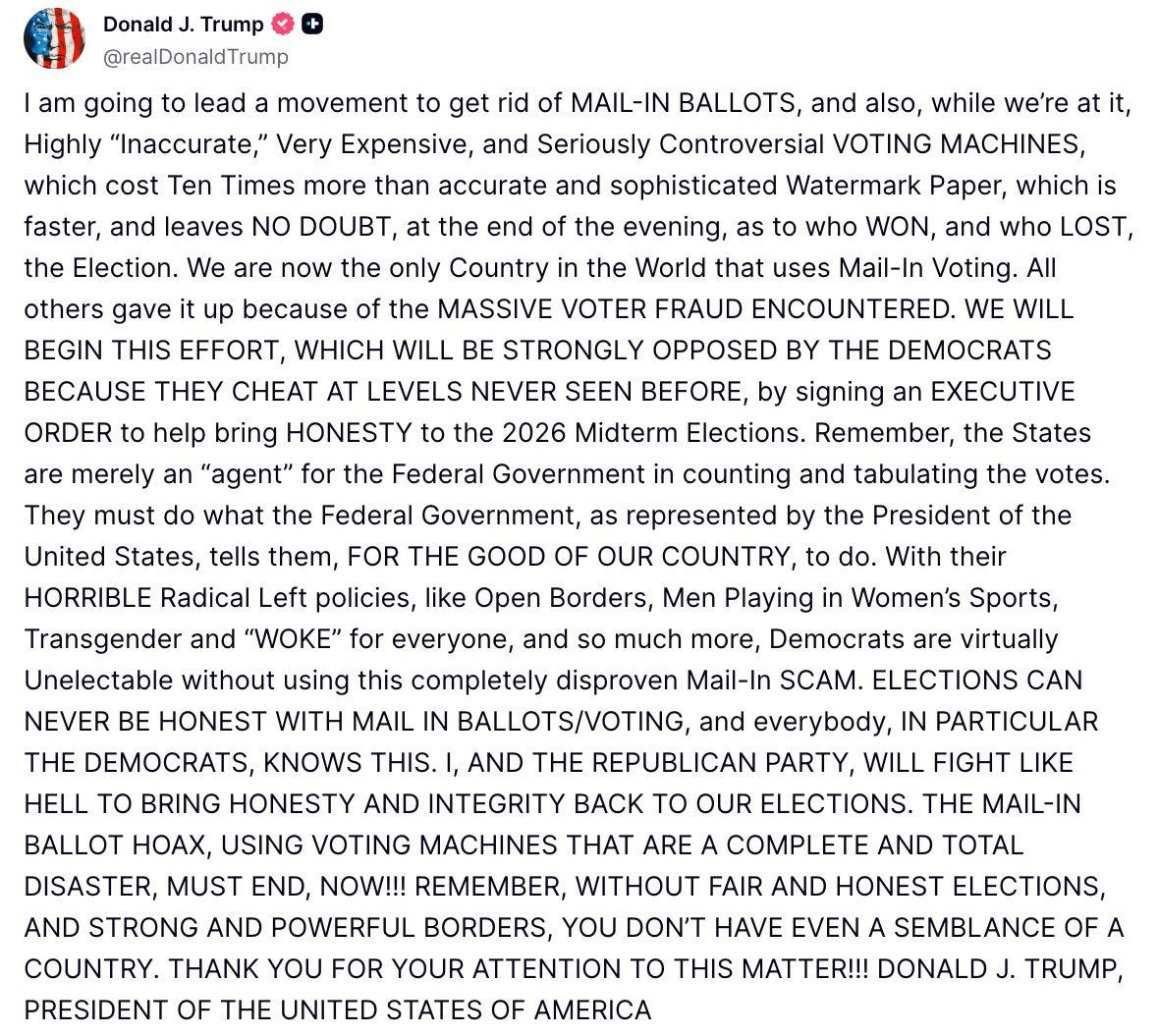 There’s one line from Trump’s rant that had the media quaking the hardest: “We will begin this effort by signing an executive order to help bring HONESTY to the 2026 Midterm Elections.”