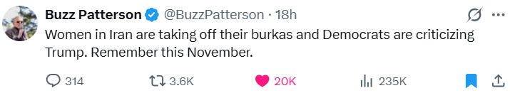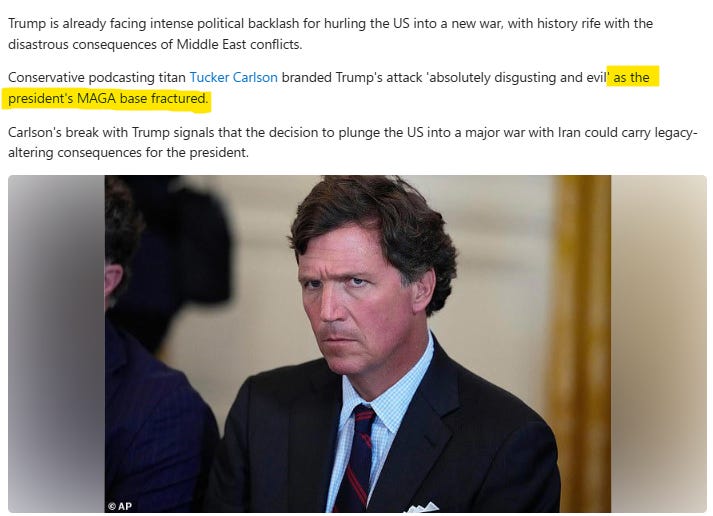 While the left-wing media are being forced—over and over—to report Iranians hailing President Trump, many of his one-time loyalists refuse to join the conga line. Former Congresswoman Marjorie Taylor Greene has been rage-tweeting her disgust for 48-hours straight. Alex Jones promptly launched a Trump Breaks Campaign Promises tour. Tucker Carlson condemned the strikes with enough melodrama to qualify for a daytime Emmy—and the media immediately latched onto it as proof (for the fourth time this week alone) that MAGA is on life support. Meanwhile, Iranians themselves—again, the people whose lives are actually directly impacted by all of this—are publicly insisting that Trump just singlehandedly saved the entire planet.