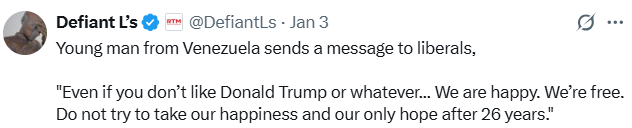 Regardless of how actual Venezuelans are reacting, Western media spiraled into DEFCON hysteria. Within minutes, headlines heralded “dangerous precedents,” “imperial overreach,” and “the collapse of international norms.” Many of those warnings came from the same outlets that have long described Maduro as illegitimate, cartel-adjacent, and authoritarian, while simultaneously treating his indefinite rule as a regrettable but immovable fact of life. (Apparently, condemning tyranny is fine; it’s the doing something about it part that inspires indignation.) Now they’ve discovered Venezuelan sovereignty. Touching.