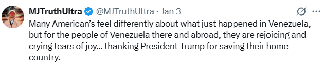Are there risks? Without a doubt. Power vacuums are a thing. Transitional governments are wobbly at best. There are questions about precedent, escalation, and what comes next—not just for Venezuela, but for how states think about sovereignty going forward. I mean, if the U.S. can more or less declare itself the Supreme Ruler of the Universe today, what’s stopping China, Russia, or Iran from doing the same thing tomorrow? These are legitimate concerns, and they deserve to be treated as such.