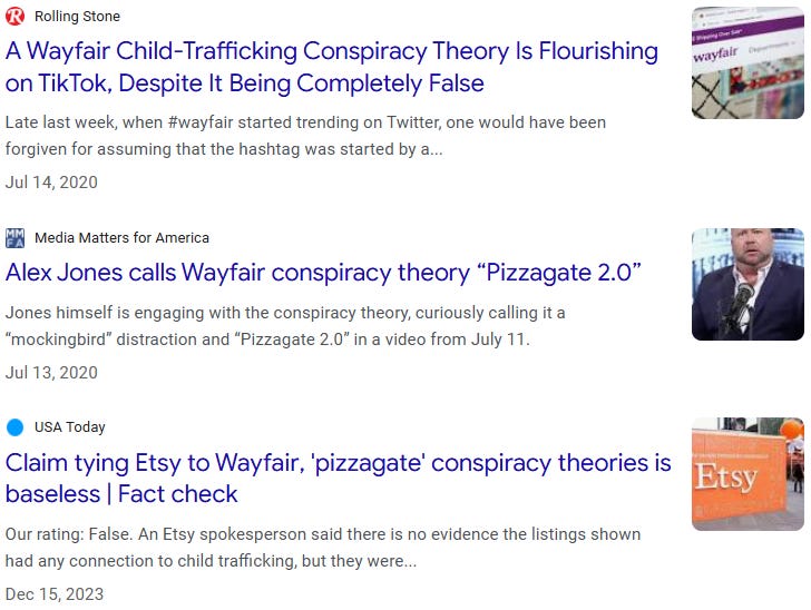But just like that, because Wayfair said of course there’s no truth to the claims hahahaha you silly flat-earthers, it was settled via the magic wand every newsroom waves to banish any further discussion: “This has been debunked.” And just in case anyone wasn’t fully hypnotized, they followed with the guaranteed narrative fire extinguisher: “Wayfair Trafficking Missing Children Is Another QAnon Conspiracy Theory Like Pizzagate.”