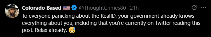 The funniest part to me is that if they’d positioned Real ID as the unequivocal way to ensure secure elections and thwart voter fraud, the flag-waving freedom fighters would have been the first to line up. But because they framed it as “for our own good,” hordes of pandemic-traumatized Americans are looking for any loophole they can slip through to opt out of Big Brother’s latest Trust Us project.
