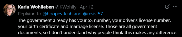 “Border Barbie” Kristi Noem is pushing the thing harder than a used car salesman with rent due tomorrow on X, insisting that “Real IDs make identification harder to forge, thwarting criminals and terrorists.” Call me conspiratorial, but what’s to stop a person from bringing a fat stack of someone else’s proof-of-life to the DMV and making their fake identity official? (I knew a gal in college who literally did this; when the “borrowed” ID she’d been using to barhop expired, she waltzed right into the DMV and got a shiny new one—this time with her own actual photo on it.)