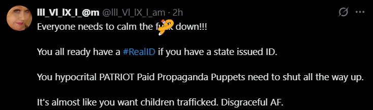 On the other side is a mob of anti-Karens refusing to lose it, cackling at all the commotion, and basically calling anyone who opposes the new beefed-up IDs child-trafficking accomplices.
